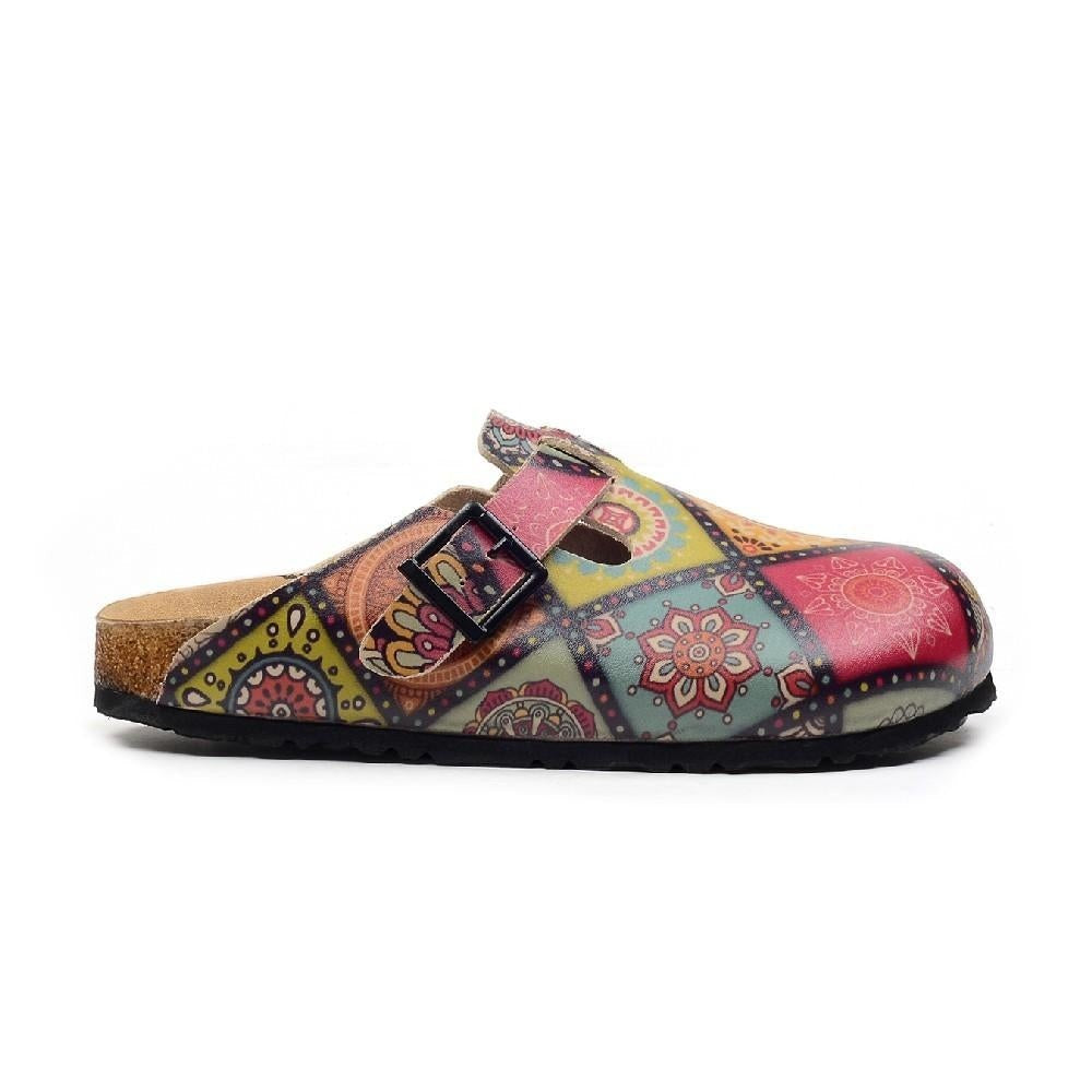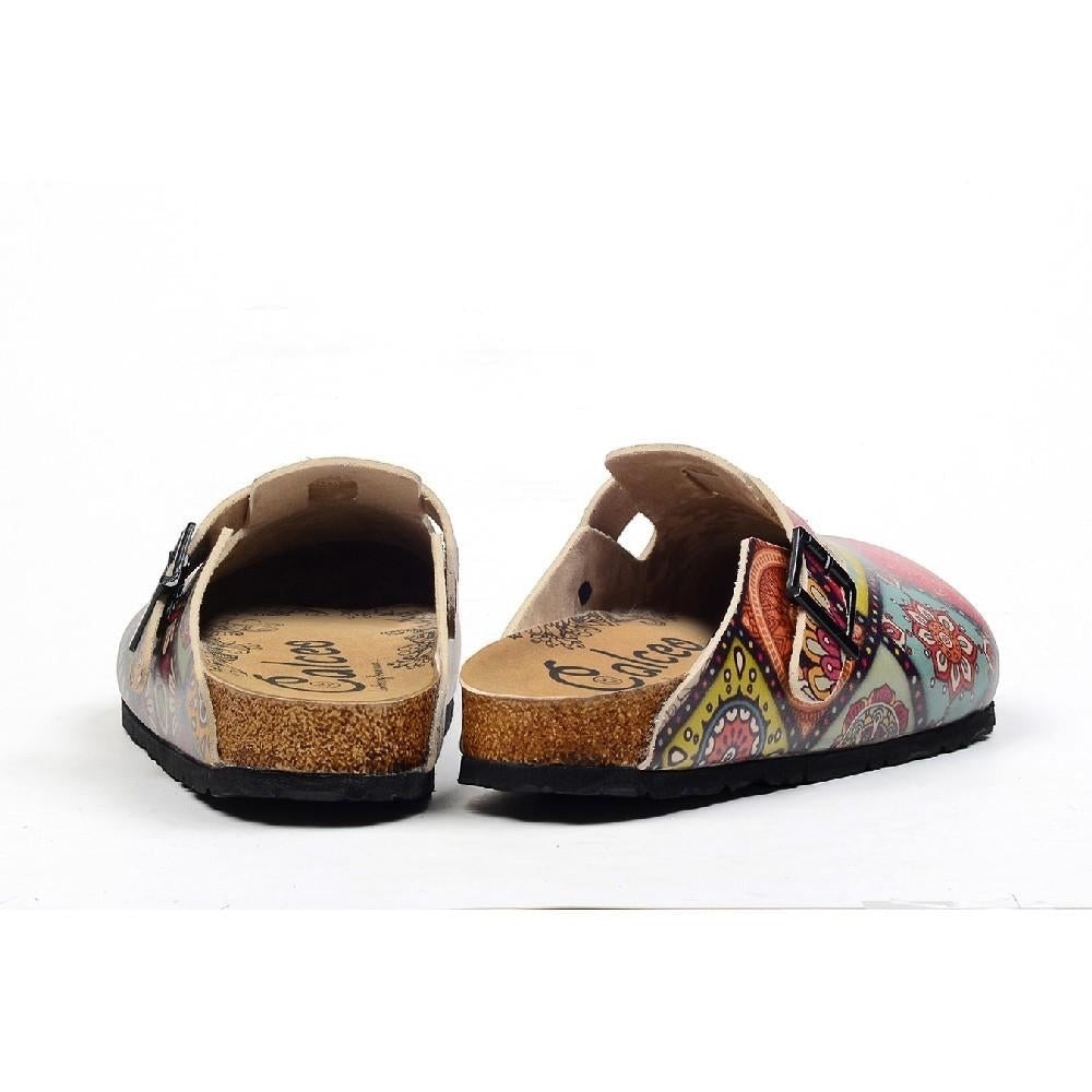 Calceo.co clogs with a colorful patchwork print, featuring a buckle strap and a cork sole. Made from artificial leather and cotton canvas. Clogs CAL3400 (2272887177312)